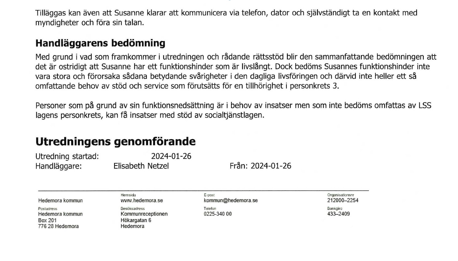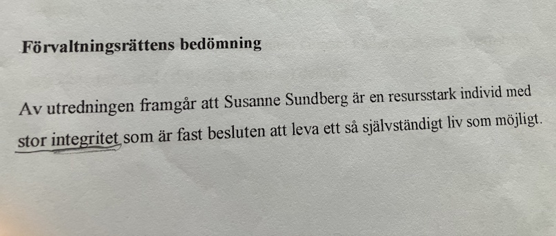 Då sade handläggarens chef att det hade blivit fel och att hon skulle ”ta hand om det". Susanne Sundbergs ärende togs upp i den kommunala nämnden och hon fick då fyra timmar assistans per dygn.